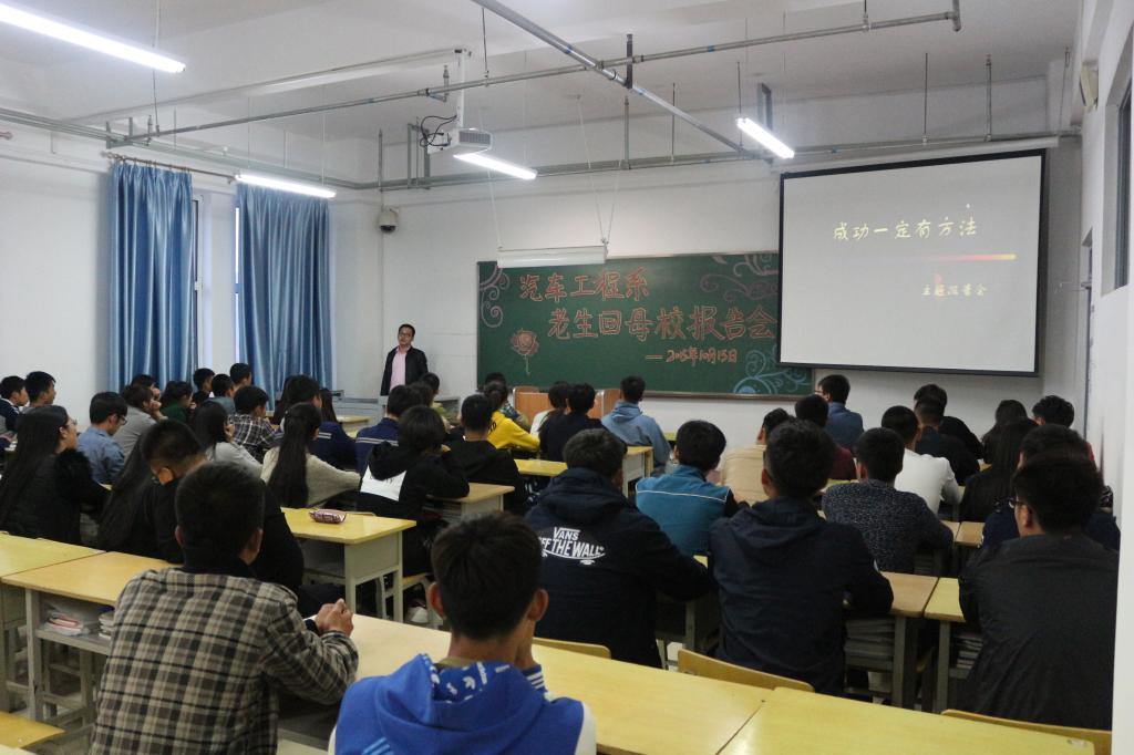 2015年10月15日晚,汽车工程系在教学楼709教室召开了老生回母校报告会。系党总支部书记王力群、辅导员老师王亚明、2014年毕业生姜宏达、2014和2015级全体学生干部参加了本次会议。会议由王老师主持。