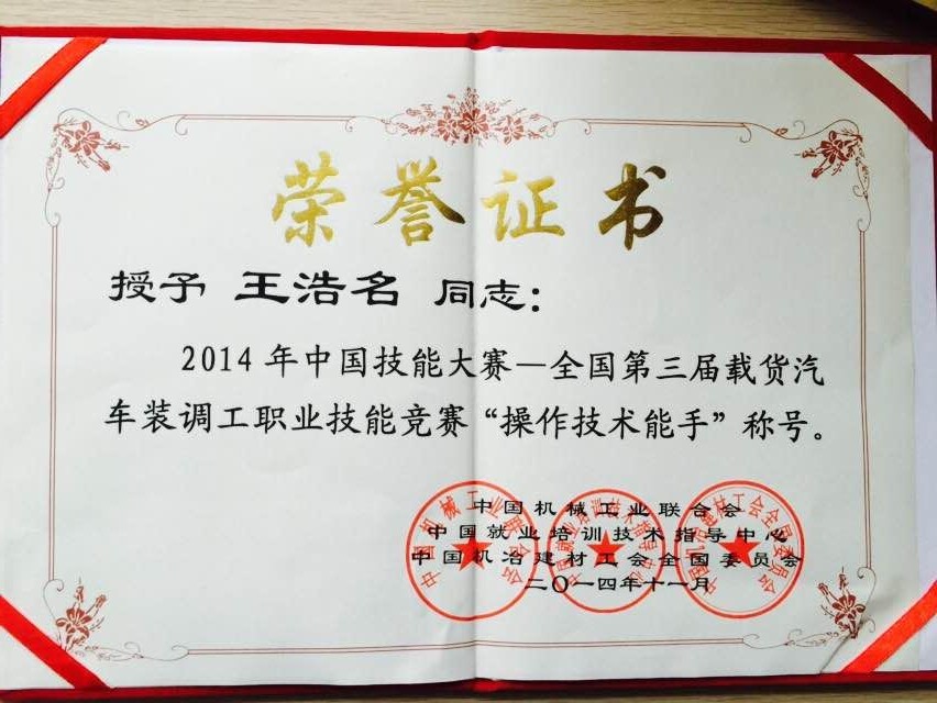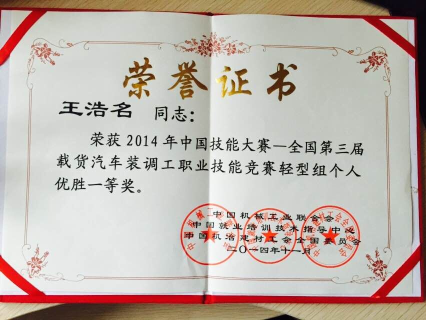 因优异的工作业绩和表现,王浩名同学2011年被福田汽车集团评为“2011年度优秀员工”;2012年被福田汽车集团评为“2012年度先进个人”;2014年参加“全国第三届载货汽车装调工职业技能竞赛”荣获大赛个人优胜一等奖;2014年被中国机冶建材工会全国委员会授予“操作技能能手”荣誉称号;2014年所带领的在线支持技术小组被评为“北汽集团先进职工小家”;2015年1月被评为“福田汽车集团2014年度劳动模范”;2015年3月被评为“福田汽车集团技术青年之星”;2015年4月被中国汽车工业协会、宋庆龄基金会评为“最美汽车人”;2015年6月被全国总工会授予“全国五一劳动奖章”;2015年7月被福田汽车集团评为“优秀共产党员标兵”;至2015年,他牵头组织整改和优化的项目累计达43项,降低生产成本70多万元,并且大幅提升了整车的可靠性,实现了整车调试环节的质量跃级。