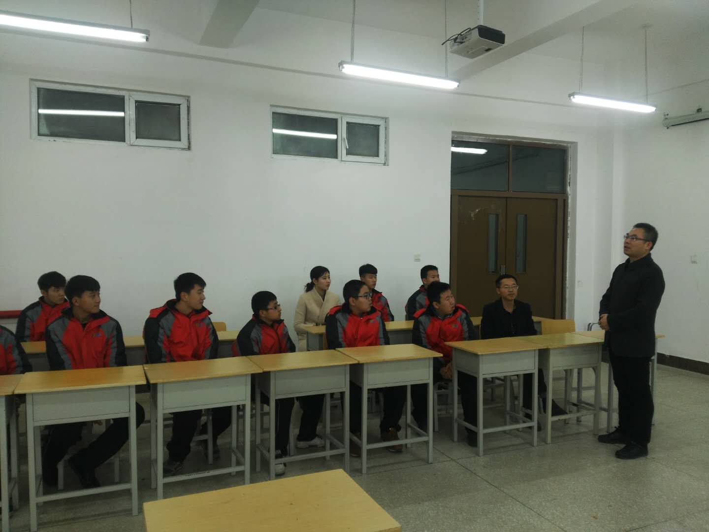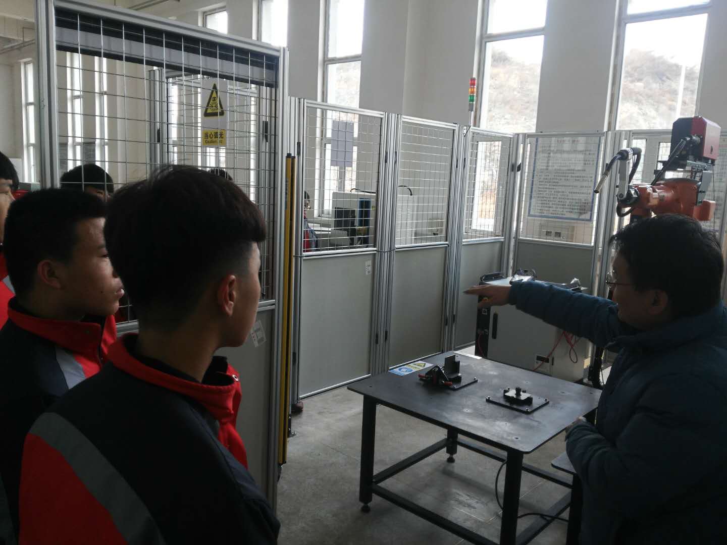 中职学校师生到校后,首先,为他们介绍了校园的基本情况;其次,走访了学校的体育场,餐饮中心,寝室;最后,参观了教学实训场地--焊接实训室。