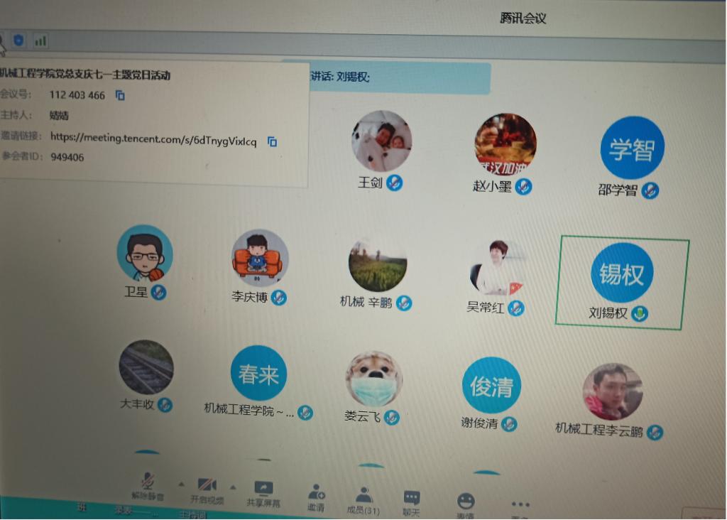 为隆重庆祝中国共产党建党99周年,回顾党的奋斗历史,讴歌党的光辉伟绩,6月28日下午,机械工程学院党总支利用“云端”开展了“党旗引领 匠心筑梦”庆七一建党节主题党日活动,活动有诗歌演讲、优秀党员故事宣讲、视频展播等,内容丰富、形式多样,以实际行动体现了对建党99周年的祝贺,以满腔热血表达了对党和国家的热爱。机械工程学院全体党员、教师共31人参加了此次活动。