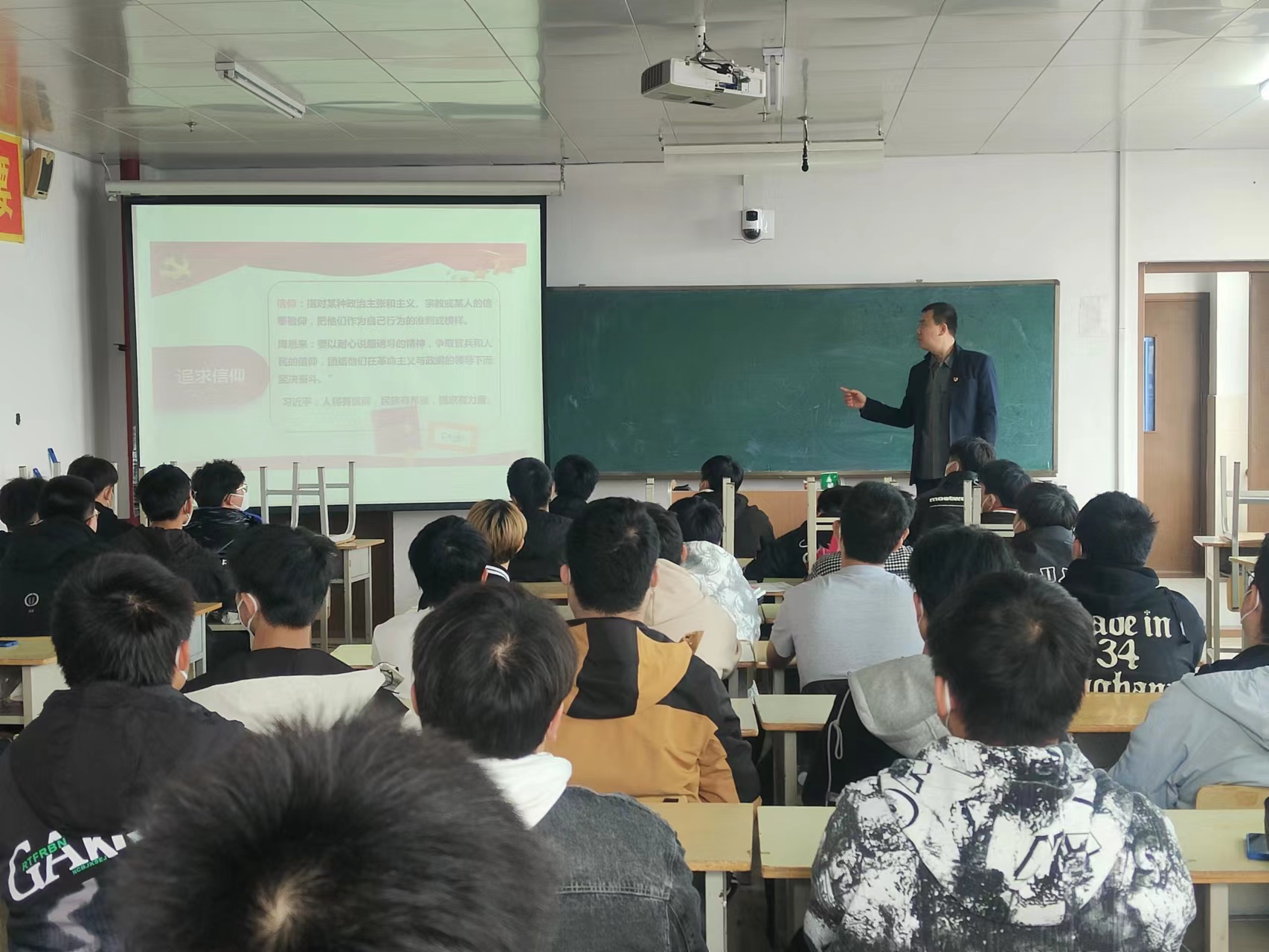 学生党支部书记于鹏在授课时,通过优秀学生党员事例,鼓励同学们体会优秀党员的思想觉悟,引导同学们树立正确的入党动机。