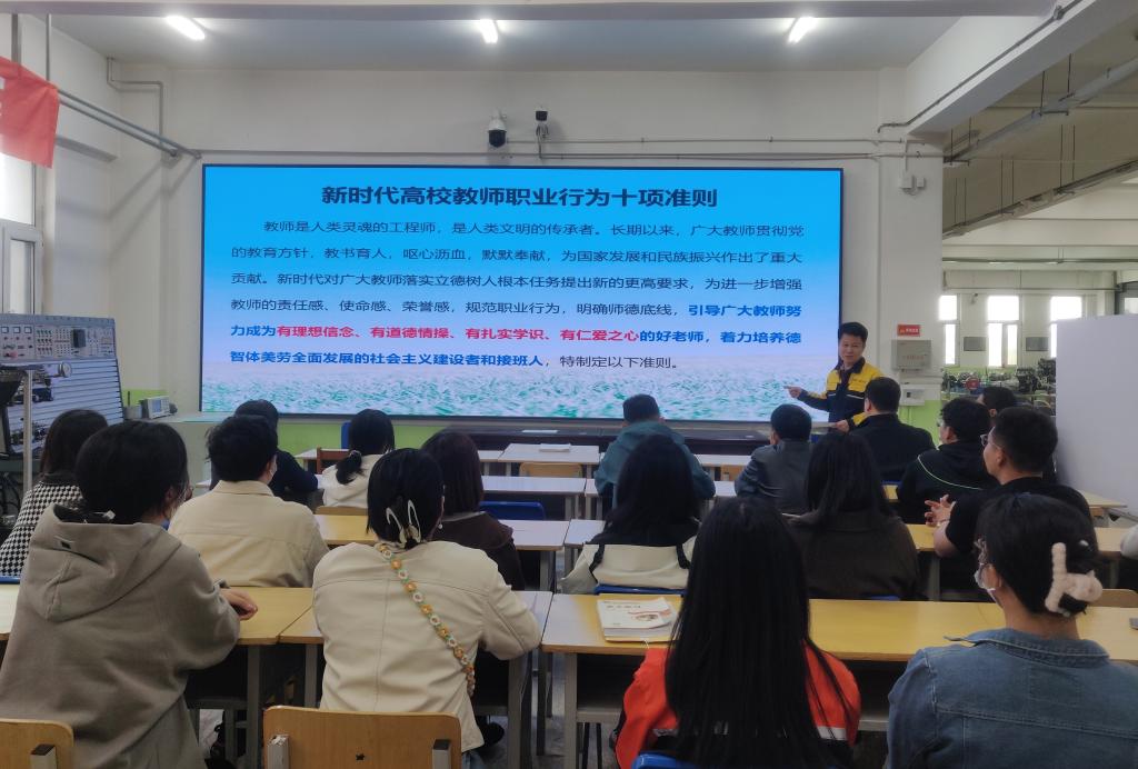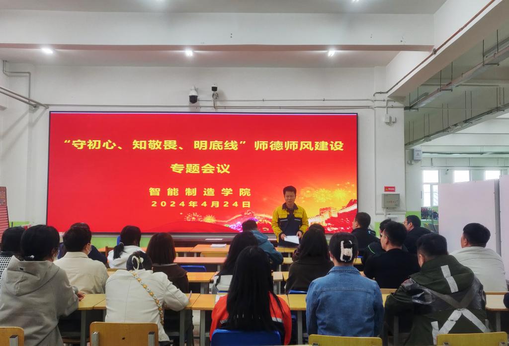 为进一步贯彻落实党的教育方针,加强我院师德师风建设,严明底线红线,打造德才兼备的高素质队伍,营造风清气正的育人环境。4月24日下午,智能制造学院召开了“守初心、知敬畏、明底线”师德师风建设专题会议,警示教育全体教师守初心、知敬畏、明底线,筑牢教师应有的思想道德防线。学院全体教师参加本次会议,会议由党总支书记董大伟主持。