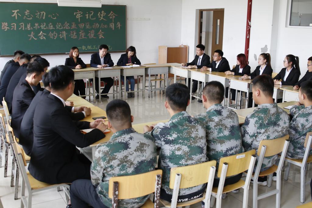 5月17日,机械工程分院开展了“学习习总书记在纪念五四运动100周年大会上讲话”的学生座谈会,党总支书记刘锡权、分团委书记罗伟、辅导员邹慧和全体班级团支书等参加了此次座谈会。