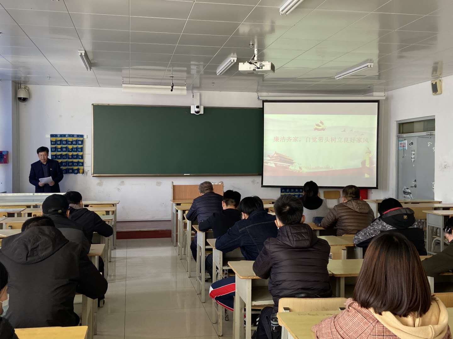 会上,党总支书记刘锡权和党总支纪检委员、副院长董大伟分别为全体党员上了《廉洁齐家,自觉带头树立良好家风》和《保持清正廉洁政治本色、做人民满意的好老师》的廉政党课。刘锡权以《礼记·大学》中“古之欲明明德于天下者,先治其国;欲治其国者,先齐其家;欲齐其家者,先修其身。”为开端提醒大家要严于修身,要从立志和勤学方面加强自身修养;要诚信爱国,诚信是仁义礼智信的根本,各种行为的源泉,爱国即是爱家,国强才能家安,要家风正,就要先爱国;要严于律己,要心存敬畏、手握戒尺,慎独慎微、勤于自省,遵守党纪国法,做到廉洁从政,廉洁从教。他号召大家用习近平新时代中国特色社会主义思想武装头脑,胸怀爱国之情,诚信守纪,严于侓己,树优良的家风。