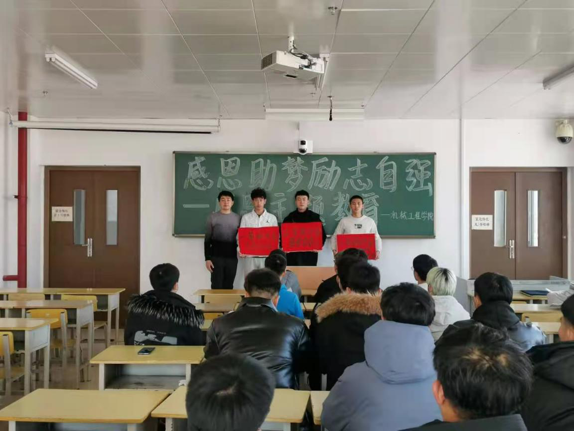 为资助家庭有困难的学生成长成才,机械工程学院根据国家资助政策和学校教育资助有关要求,采取了一系列有效举措,帮助家庭困难的学生实现梦想。为了帮助受资助的学生摆脱家庭困难的心理影响,立志自强,励志成才,心存感恩,回馈社会,回报家国,12月2日,2020级辅导员李庆博在教学楼701举办“感恩助梦,励志自强”的主题教育活动。